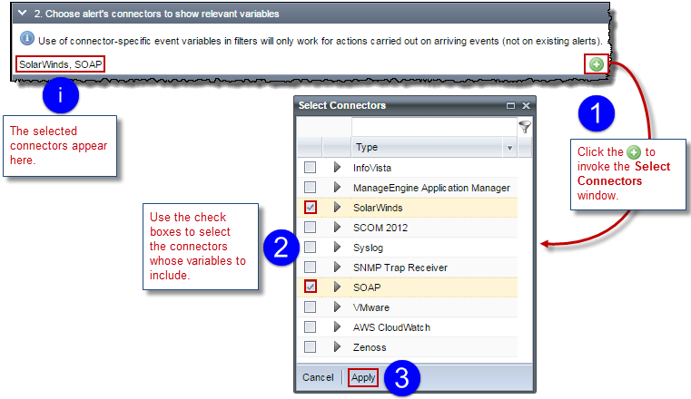 Note that use of connector -specific event variables in filters will only work for actions carried out on arriving events (not on existing alerts).