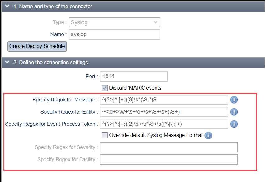 Syslog - See Accessing Connector Documentation, Software, and Controls and Understanding the Syslog Connector Regex Settings.